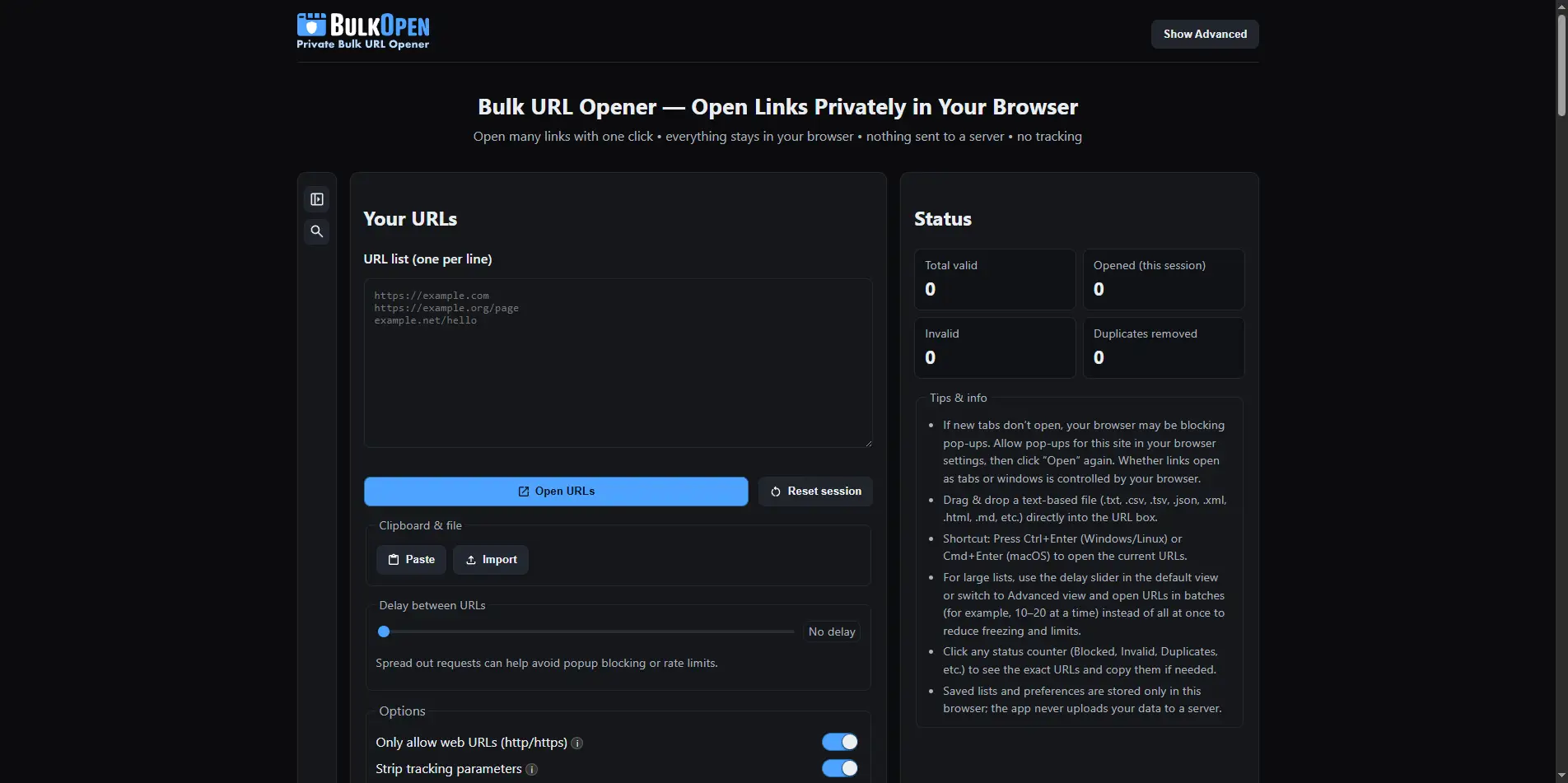 BulkOpen is a 100% private, local power-tool that opens unlimited URL lists without tracking or server uploads. It strips hidden trackers and bypasses blockers using smart, local processing so your data is always safe and secure.